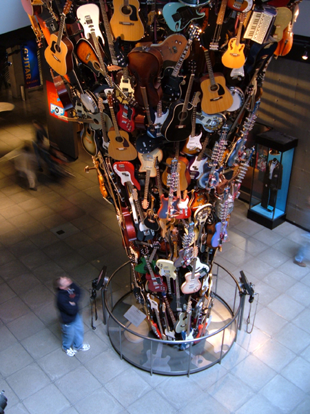 The five guitars each house a speaker, LED’s and a distance sensor. The wires connect down through the plinth connecting to the arduino and computer. There are extra speakers housed within the plinth incase of louder sound needed on the private view. Approaching a guitar will activate a layer of music allocated to it. The sounds are played through all speakers. This enables all layers to be heard easily by all people surrounding the sculpture.
