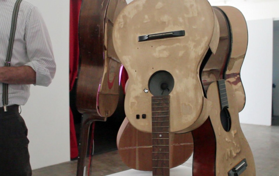 Collecting broken guitars, I played with how they looked, taking them apart, breaking them, sanding them and putting them back together. Deconstructing and reconstructing them creates an interesting aesthetic that keeps the familiarity of the instrument and is in keeping with the concept of re-thinking how a familiar instrument can be ‘played’. The placing of the guitars was based on old sketches and the title, The Honest Time, is adapted from the title of a song I wrote which the ambient composition is based upon.