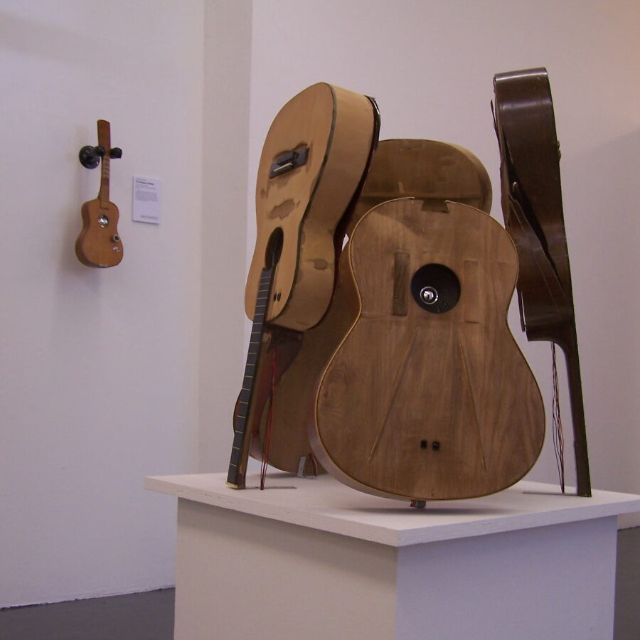 The plinth version was then developed into a wall version for a solo show at PS2 Gallery Belfast. The wall arrangement of the Guitar Sculpture offered elements of an alternative sonic composition entitled New Wave, allowing the audience to perform and mix layers of the song through triggering the guitars and their associated tracks.